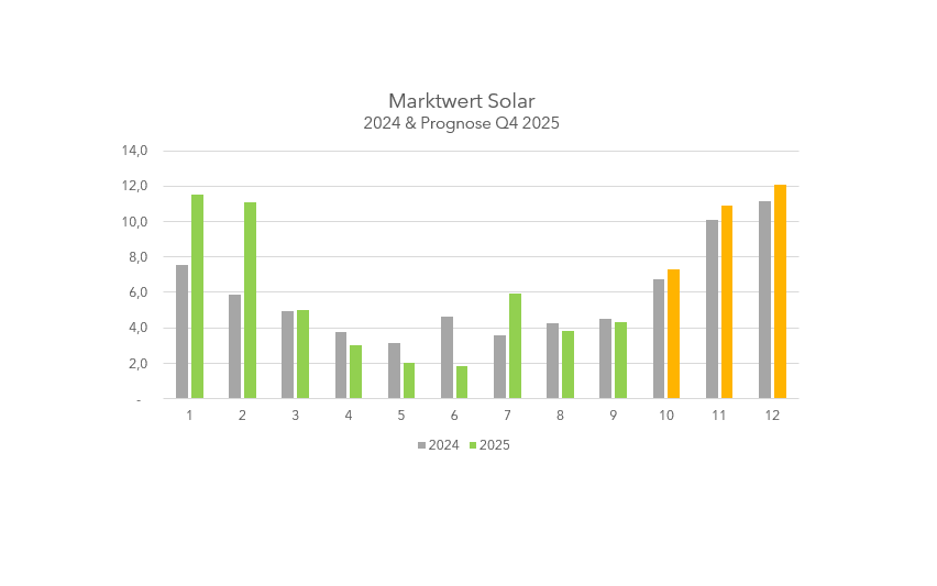 Unsere Prognose für den Marktwert Solar im Q4 2025 zeigt ein leicht höheres Niveau im Vergleich zum Vorjahr. Der Prognose zugrunde liegen die Erzeugungs- und Verbrauchsdaten der Plattform Energy Charts des Fraunhofer Instituts für solare Energiesysteme.